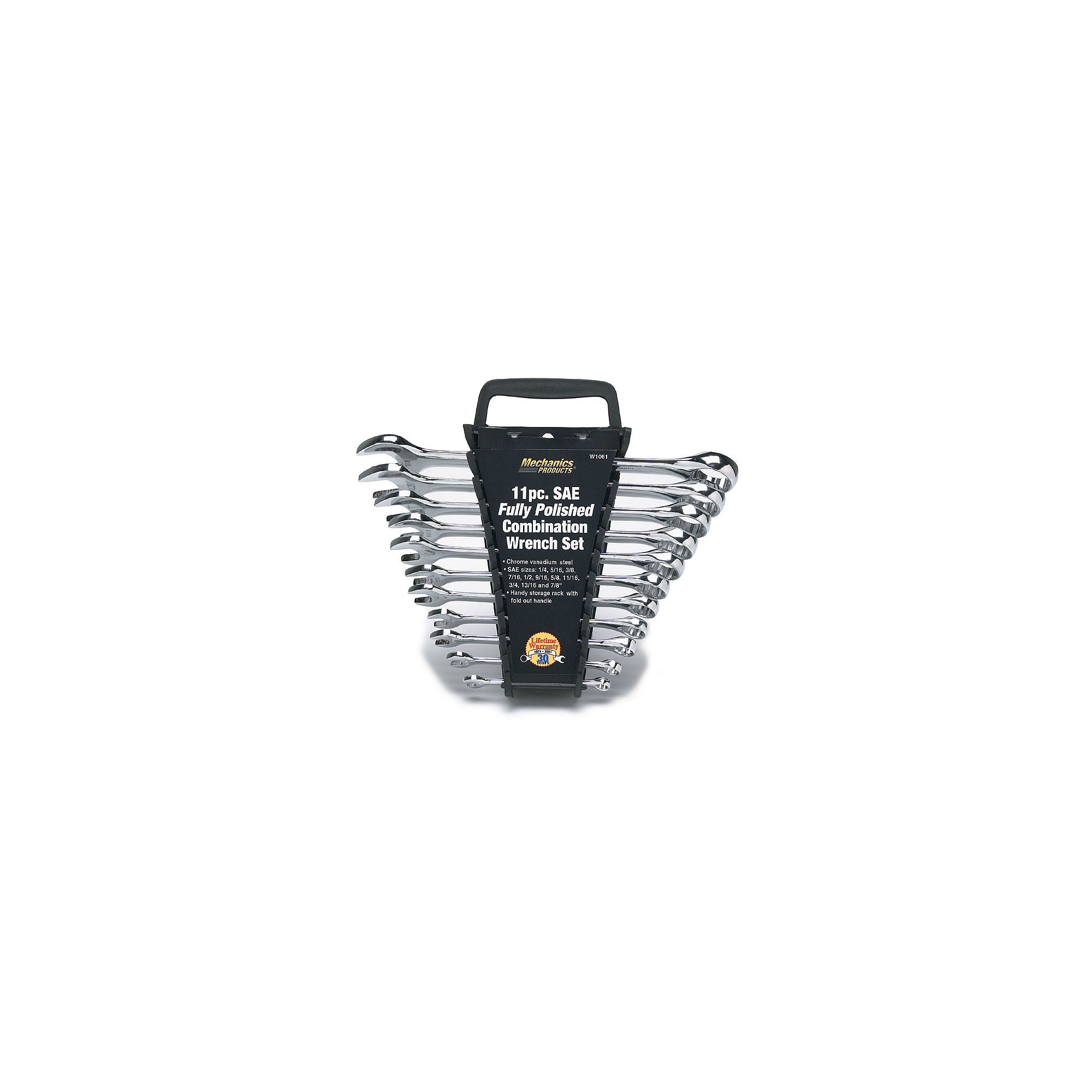 Performance Tool Mechanics Products 11 Piece SAE Full Polish Combination Wrench Set with Handy Storage Rack. Professional Look Fully Polished Chrome Vanadium Steel Wrenches are Strong and Good Looking.Specifications