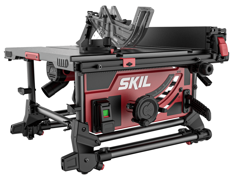 The SKIL Jobsite Table Saw has a 25-1/2" (64.77cm) Rip Capacity and is equipped with a 15-Amp motor, integrated foldable legs, rack & pinion fence rails, and a dust port elbow to keep your jobsite clean. The 15-Amp motor quickly rips through hardwoods with ease, while the rack & pinion fence rails make fence adjustments fast, smooth, and accurate. With its 0-45° bevel capacity, the quick release lever allows for cuts between two positive stops at 0 and 45 degrees, and its 4x4 cutting capacity allows for swift 90-degree cutting. The integrated foldable legs seamlessly form into a folding stand to provide portability and convenience, while the dust port elbow systematically redirects dust to a container for easy cleanup. The parallel blade alignment allows for ease of blade adjustment along the rip fence and miter slot, for precise accurate cuts. This table saw features a safety anti-restart switch in case of power outages. This large coated cast aluminum tabletop saw comes equipped with a 10" 24-tooth carbide blade. When using a dado insert, this table saw requires an 8 in. dado blade set.Specifications