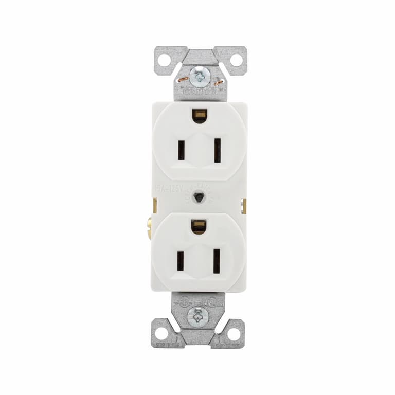 125 volt; 15 amp; 2 pole; 3 wire; 5-15R NEMA; Back & side wired; Commercial grade; Nylon face & body with steel strap material; Self grounding; Straight blade; White