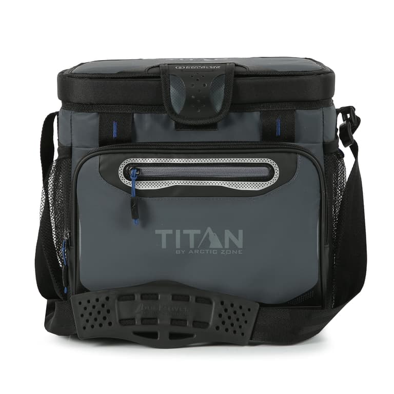 The Titan 16 Can Zipperless HardBody Cooler keeps ice up to 2 days and includes a flip-open, patented Zipperless lid that provides quick access to food and drinks as well as an insulated front pocket.The interior of the cooler features Deep Freeze Performance Insulation with radiant heat barrier and triple layer ColdBlock base for superior cooling.The cooler includes a durable HardBody liner with SmartShelf. The SmartShelf allows you to keep hard stuff like drinks separate from soft stuff, so sandwiches and other soft foods don’t get crushed. If you want to use the entire liner, the SmartShelf easily removes to provide one large compartment.Designed for convenience and usability, this cooler also features an adjustable Backsaver shoulder strap with anti-slip shoulder pad that centers load weight for easier carrying and a durable, easy clean, water and stain repellent exterior.Specifications