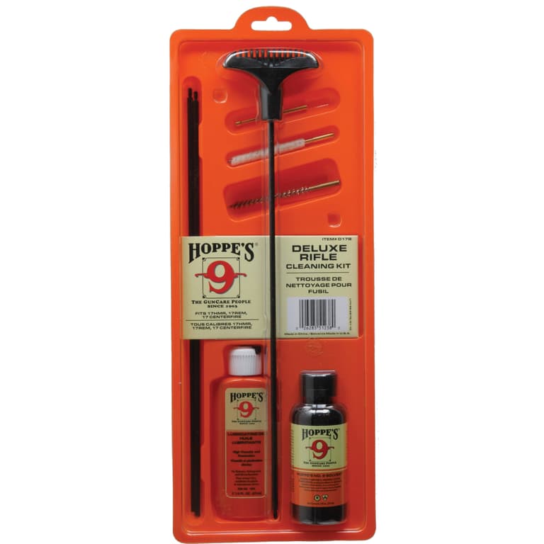 Hoppe's Varmint Rifle Cleaning Kit includes No. 9 solvent, No. 9 lubricating oil, and an aluminum rod with a knob, slotted ends and brush to keep your gun clean and shooting properly.