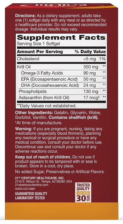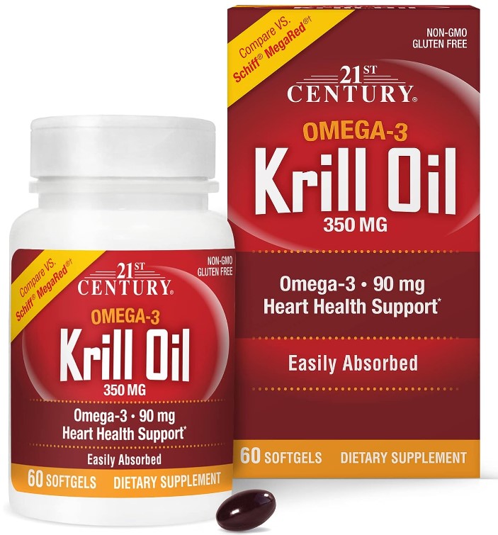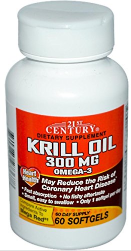 Reap all of the heart-healthy benefits of krill oil without the fishy aftertaste or odor wth 21st Century Krill Oil.21ST Century Krill Oil provides Omega-3 fatty acids. EPA and DHA are important Omega-3 fatty acids that support cardiovascular health as well as being important components of the cells in the body. Krill Oil is from small red-colored crustaceans that thrive in cold water and are similar to shrimp. The Omega-3 Fatty Acids in Krill Oil exist as the natural phospholipids form found in krill. One small softgel provides an optimal combination of Omega-3 Fatty Acids for Heart Health Support.Specifications