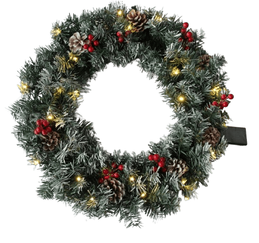 140 SPRAYED WHITE TIPS; 22" PRELIT FROSTED DECORATED WREATH; 7PC RED BERRIES & 7PC PINE CONES; B/O 30 WARM WHITE LEDS; EASY SET UP AND TAKE DOWN