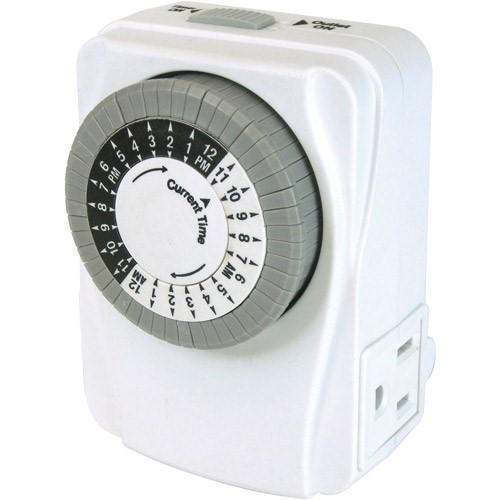 24hr repeating cycle turns outlet on & off at the same time daily; On/off override switch located on the top of the timer; Patented "Reverse" Ground-Pin: When mounted to wall, unit accepts most right-angle and transformer plugs; Patented angled housing design makes unit easier to read and program; Programmable in 30 minute time intervals providing up to 48 setting options in a 24hr period; Push-down pins are extremely easy to operate; Two 3-prong grounded outlets for use with indoor devices