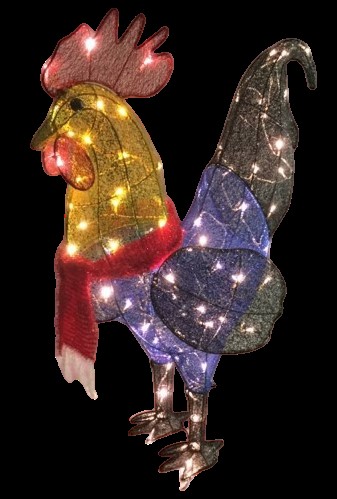 36"H PRELIT 3D COLORFUL ROOSTER; 70 LED LIGHTS; 3.5V 0.8A CUL ADAPTOR; 5' LEAD WIRE; INDOOR/OUTDOOR; EASY SET UPSpecifications