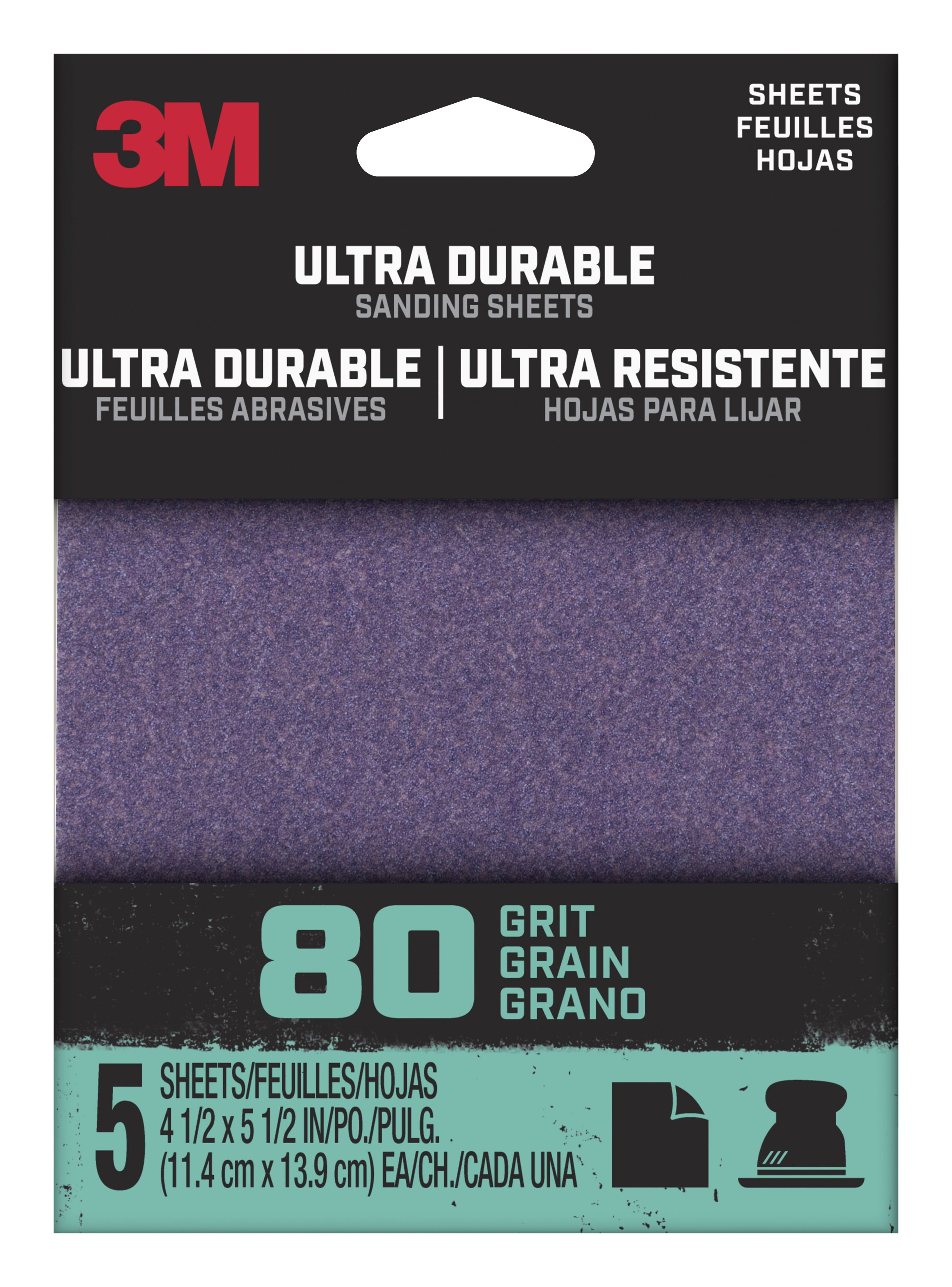 3M, 5 Pack, 80 Grit, 1/4" Ultra Durable power sanding sand paper for all purposes. Sheet size is 4.5 x 5.5". Adhesive backed for all coatings and surfaces.Specifications