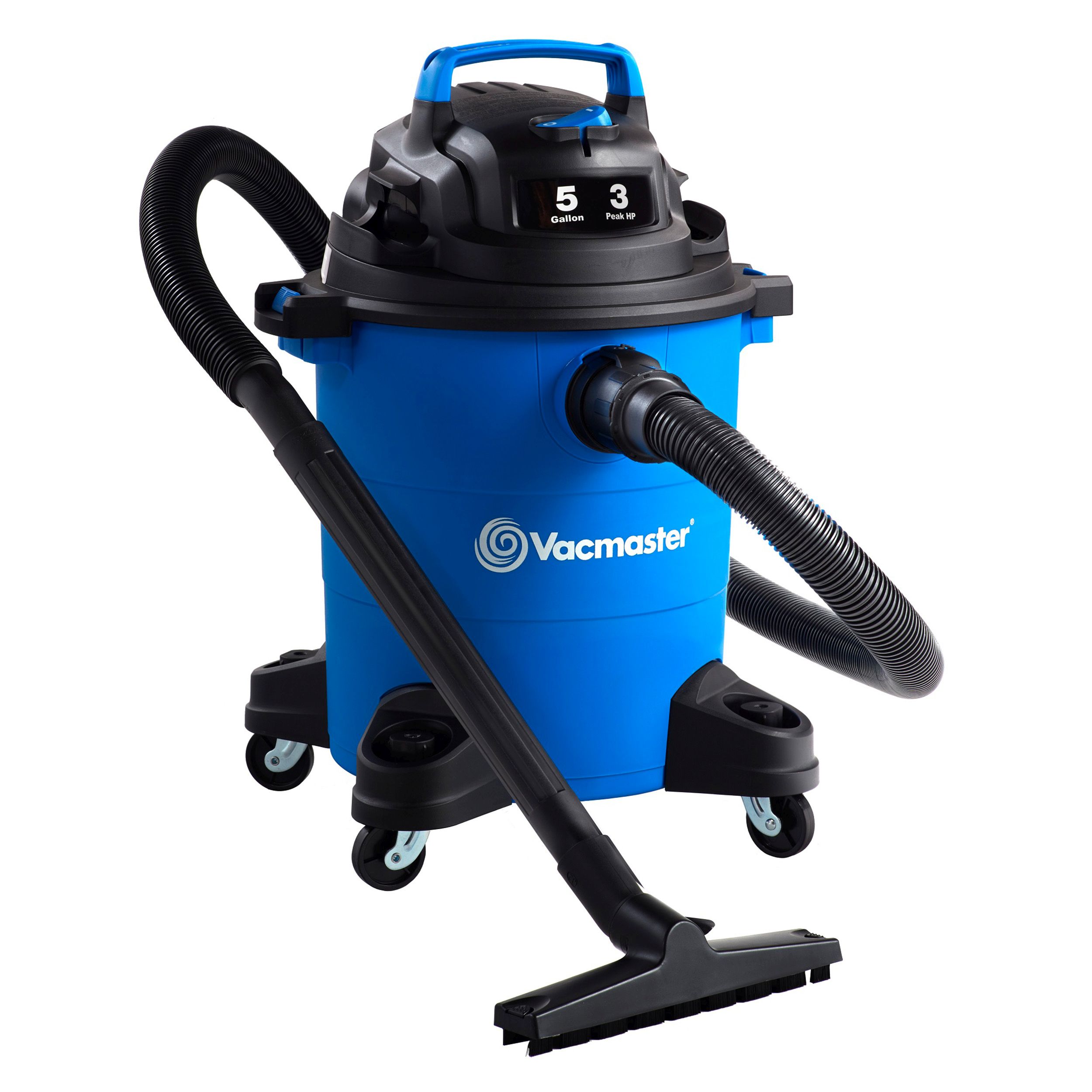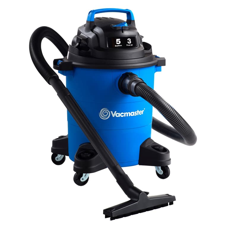 This 5-Gallon Vacmaster wet/dry vacuum is the perfect size for a variety of tasks around the house or garage. With a 3 Peak HP motor this vacuum makes cleanup easy, whether it's liquid spills in the home, or cheerios in the car. The balanced top handle design and durable, wide stance casters provide stable transportation during and after use. The on-board hose, cord, and accessory storage allows you to keep all of the attachments organized and in one place. Turning this vac into a blower to remove debris from your yard or garage could not be easier - all it takes is a simple conversion.Specifications