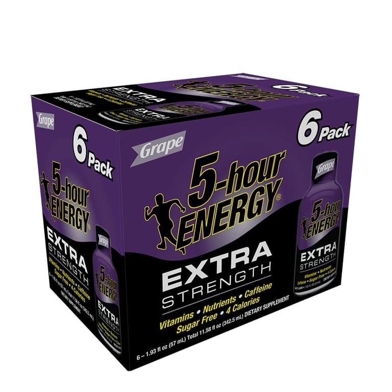 5 Hr. Energy Extra Strength Shots Grape 6 pack. Light portable and effective. The no-nonsense way for working adults to stay bright and alert. Packed with B-vitamins and amino acids. Zero sugar zero herbal stimulants and four calories. Extra StrengthContains as much caffeine as 12 oz of premium coffee. Requires no refrigeration.Specifications
