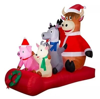 6 LED; 6 STAKES & 2 ROPES; 6'L INFLATABLE CHRISTMAS SLEDDING FARM ANIMALS; CUL ADAPTOR: 12VDC 1.25A; DURABLE WEATHERPROOF MATERIAL; EASY ASSEMBLY & STORAGE; MOTOR: 12VDC 1.0A; PIG, GOAT, COW & DONKEY
