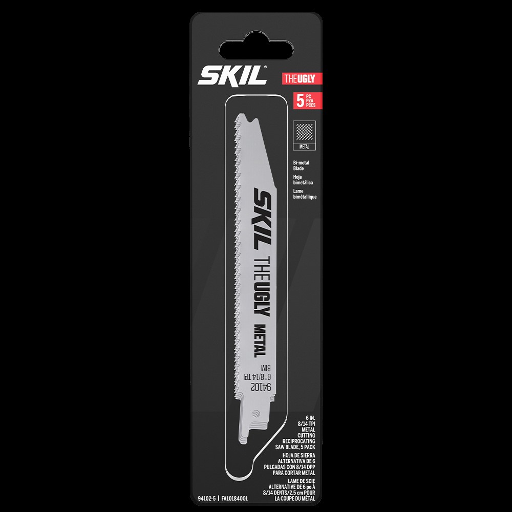 Power through metal, pipe, brackets, steel studs, and more with SKIL's The UGLY 6-Inch 8/14 TPI Metal Cutting Reciprocating Saw Blade 5-Pack. This 6-inch reciprocating saw blade features a patented progressive tooth design for consistent cutting through various stock including thick and thin metals. Its plunge body is optimized for demolition with teeth designed to enter and cut through surfaces with ease. Its reinforced solid shank construction absorbs the stress of cutting through hard metals to reduce breakage and extend the life of this reciprocating saw blade.Specifications