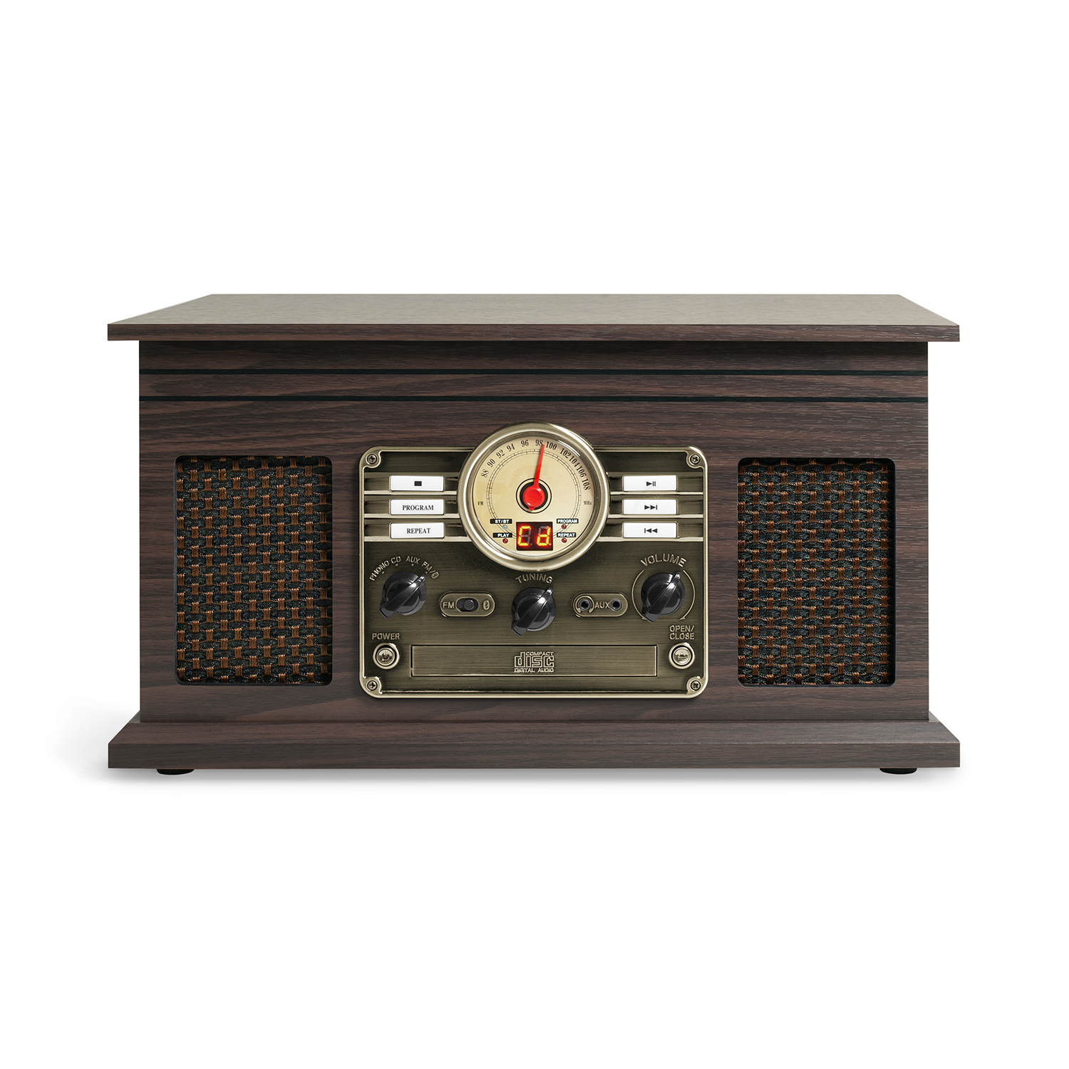 7-in-1 Turntable; Bluetooth, CD, Cassette, FM Radio, HP Jack, 3.5mm Aux-in & RCA Output; USB Recording