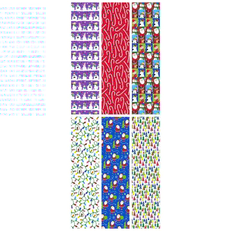 One of our Best Sellers! 6 Fun, Whimsical Designs including Candy Canes, String of Lights, Santa and more. 75 Sq. Ft. Grid lined on back for easy cutting. Made in USA!THIS PRODUCT IS SOLD AS AN ASSORTMENT. CAN NOT GUARANTEE A SPECIFIC PATTERN WHEN ORDERED ONLINE.Specifications