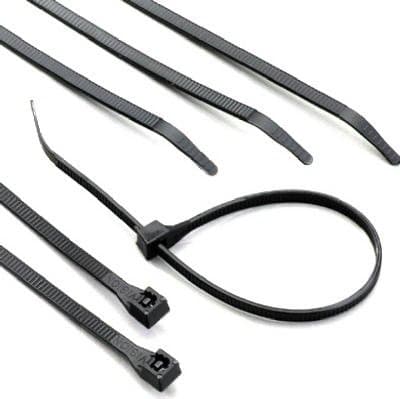 100 per card; 8 inch; Install by hand or tensioning tool; One piece molded nylon ties quickly and neatly secure wire bundles cables and harnesses; Self extinguishing fungus-inert 6/6 nylon remains serviceable through temperature range of -40 to +185 F -56 to +85 C; UV resistant black nylon tie