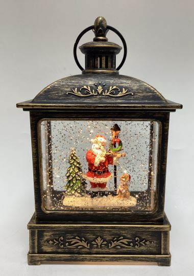 3AA BATTERIES (NOT INCLUDED); 8.5" H PRELIT RECTANGULAR BLACK BRUSHED GOLD LANTER; BATTERY OPERATED; ON/OFF SWITCH; SANTA/TREE/GOD/LAMP POST SCENE; WARM WHITE LIGHTS; WATER GLOBE