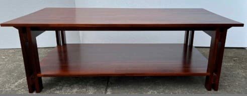 Solid Acacia Wood Arts and Crafts Style Coffee Table in Rich Mahogany Finish; Large format Size Profile; with 35mm Heavy Duty Thick Tabletop; Double Panel Legs w Bevelled Supports; Size 48"w x 26"d x 18"hSpecifications