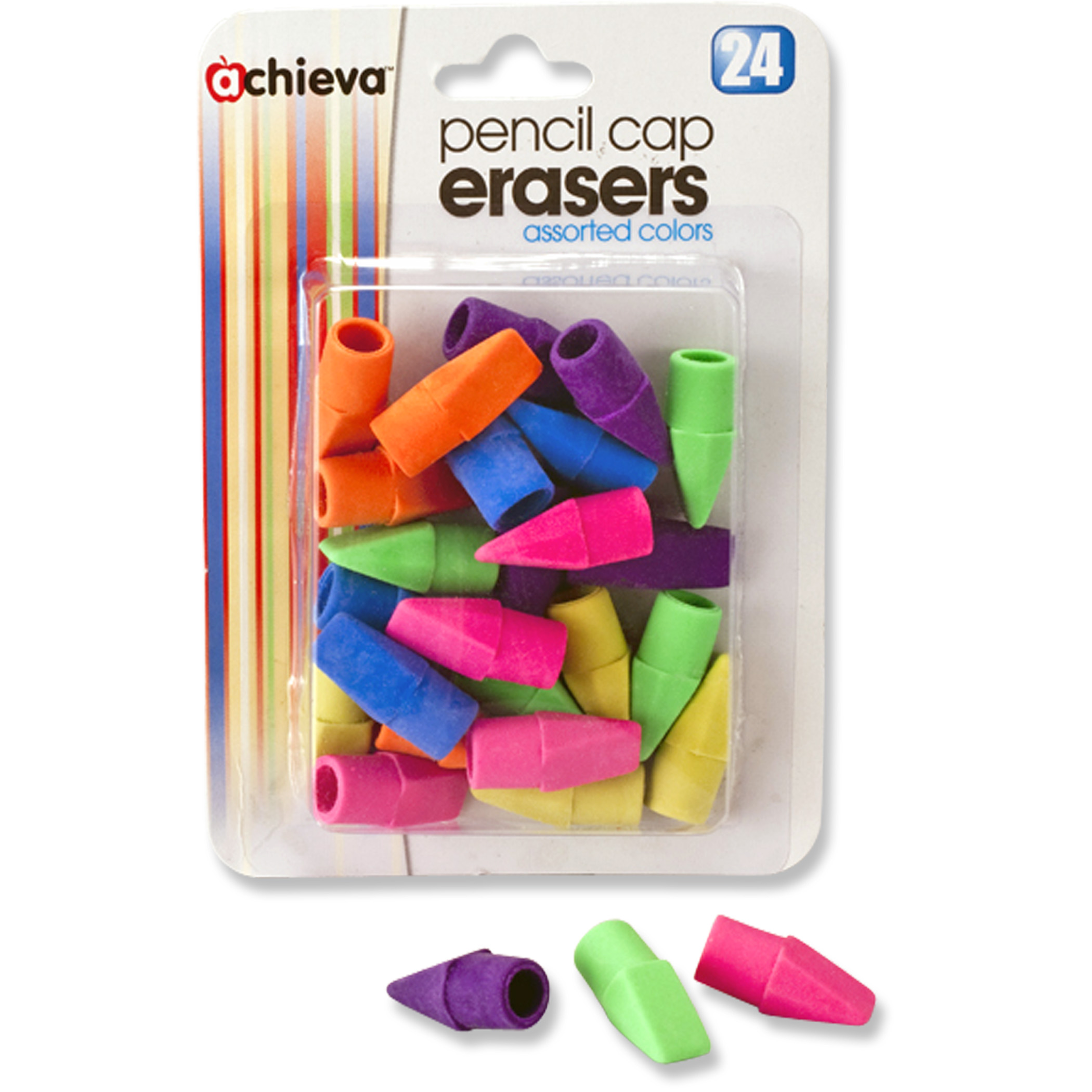 Latex-free pencil cap perfect for home or classroom use. Fits any standard size pencil. Tapered ends for erasing accuracy. Assorted Colors. Pack of 24.Specifications