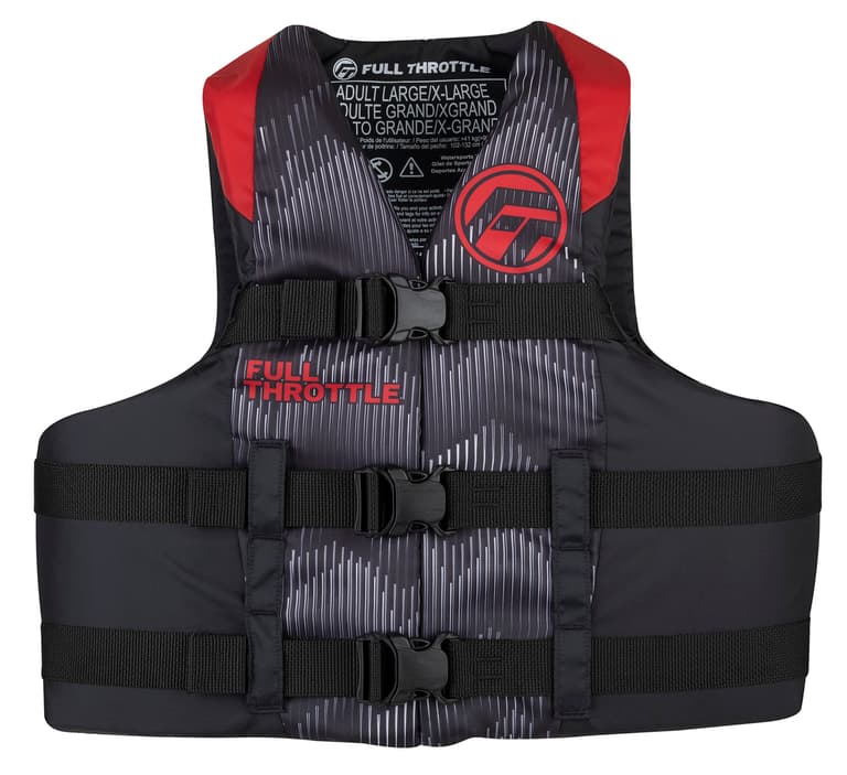 The Full Throttle adult nylon life jacket is comfortable to wear for a variety of activities like skiing, tubing, boating, fishing, or relaxing on the water. This vest is made of quality, durable fabrics and uses lightweight, durable foam that contours to your body and doesn’t hinder your mobility. U.S. Coast Guard approved and Transport Canada approved flotation device.Specifications