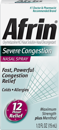 Temporarily relieves nasal congestion due to common cold hay fever upper respiratory allergies. Temporarily relieves sinus congestion and pressure. Shrinks swollen nasal membranes so you can breathe more freely. A maximum strength formula with the aromatic power of menthol. It starts to work in seconds providing up to 12 hours of relief with no drowsiness. Relief lasts all day or all night. Maximum strength. Afrin Severe Congestion Nasal Spray with Menthol 0.5 fl oz is a nasal decongestant spray that contains Oxymetazoline hydrochloride & Menthol.Specifications