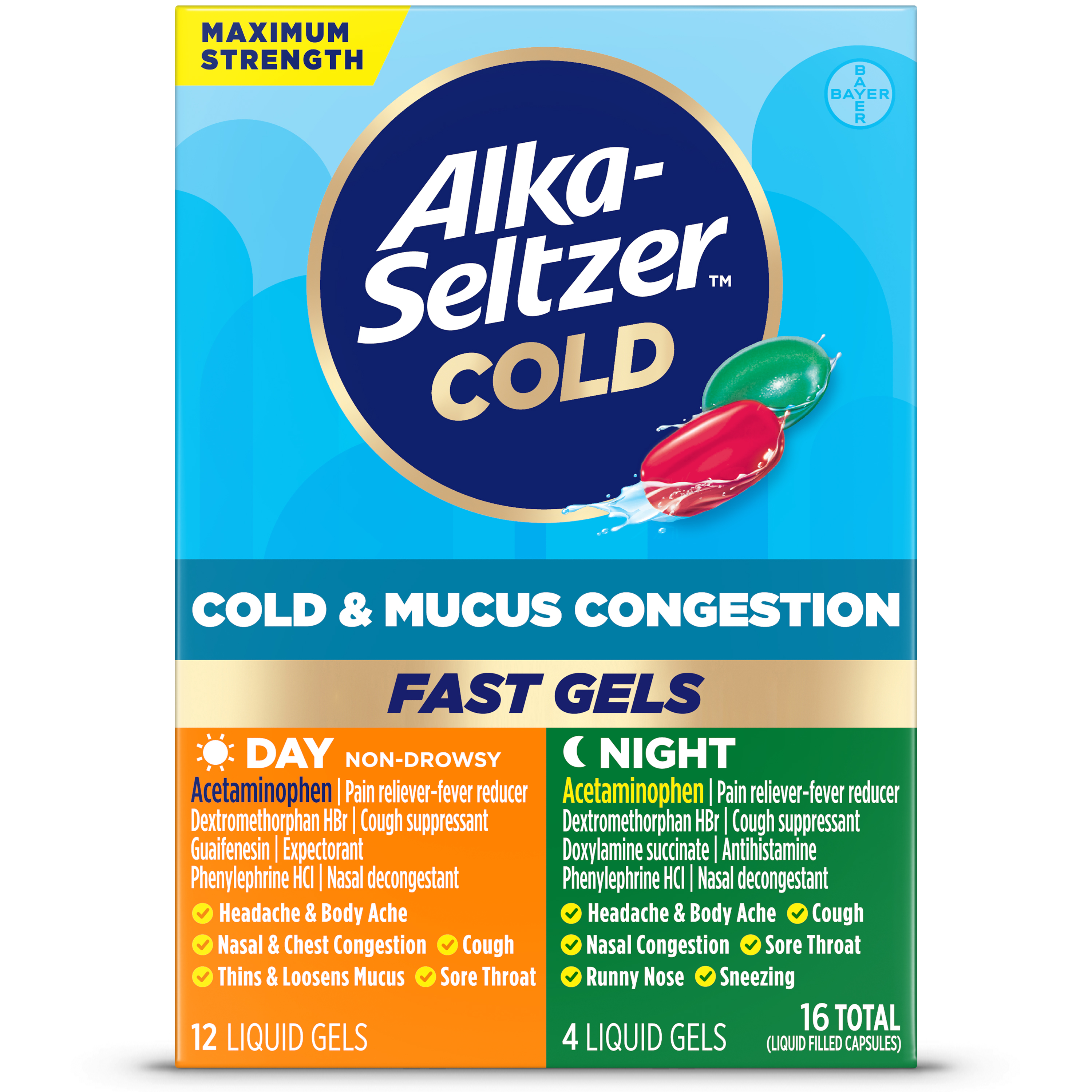 12 Day, 4 Night Power Gels; Alka-Seltzer Plus Maximum Strength Cough, Mucus & Congestion Day + Night PowerMax; Fast relief of your cough & congestion symptoms; n one convenient package you get daytime relief from: nasal congestion, sinus pressure & congestion, sore throat, headache, cough, chest congestion, body aches & pains and fever & nighttime relief from: runny nose, sneezing, cough, nasal & sinus congestion, headache, sore throat, body aches & pains and fever.