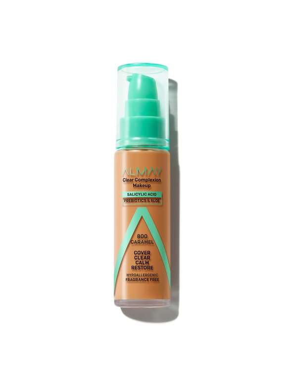 Almay’s medium coverage Clear Complexion foundation fights breakouts and supports skin health with acne-caring salicylic acid, prebiotics, and aloe vera