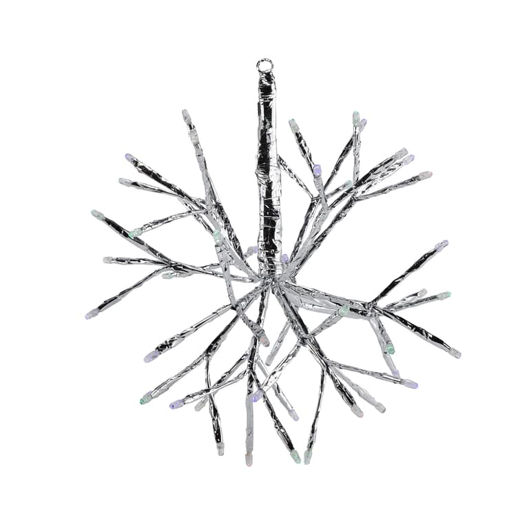 Upgrade your holiday decor with the Alpine Corporation's Twig Christmas Snowflake Ornament with Multi-Colored LED Lights! This ornament has a twig snowflake design and is wrapped with silver tape for a unique and stylish appearance. It features 40 multi-colored LED lights and 8 white twinkling lights with flashing bulbs to provide a stunning nighttime display. The flexible construction allows you to bend and twist this ornament to your desired shape. It includes a UL listed transformer for easy use throughout your home, as well as a 10 ft. cord from snowflake to plug. Hang on your Christmas tree, by your stockings, or simply over a door! This Snowflake Ornament is the perfect addition to your holiday decor.Specifications