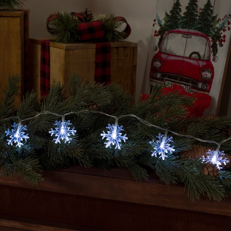 Battery-powered: operates on batteries (not included).; Festive decoration: perfect for Christmas trees, mantels, or outdoor patios.; Snowflake string lights: 20 white LED lights, 96" total length.; Timer function: automatically on for 6 hours, off for 18 hours.; Versatile: suitable for indoor and outdoor use.