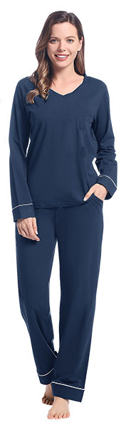 Feature: 2 SIDE POCKETS IN PANTS; KNIT FABRICATION; LONG SLEEVE; V NECK; WHITE ACCENT TRIM