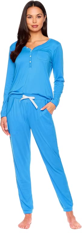 COMFORTABLE AND COZY PAJAMA SET IN A HENLEY STYLE TOP, JOGGER STYLE PANT WITH CUFFED LEGS, ELASTIC WAISTBAND AND DRAWSTRING