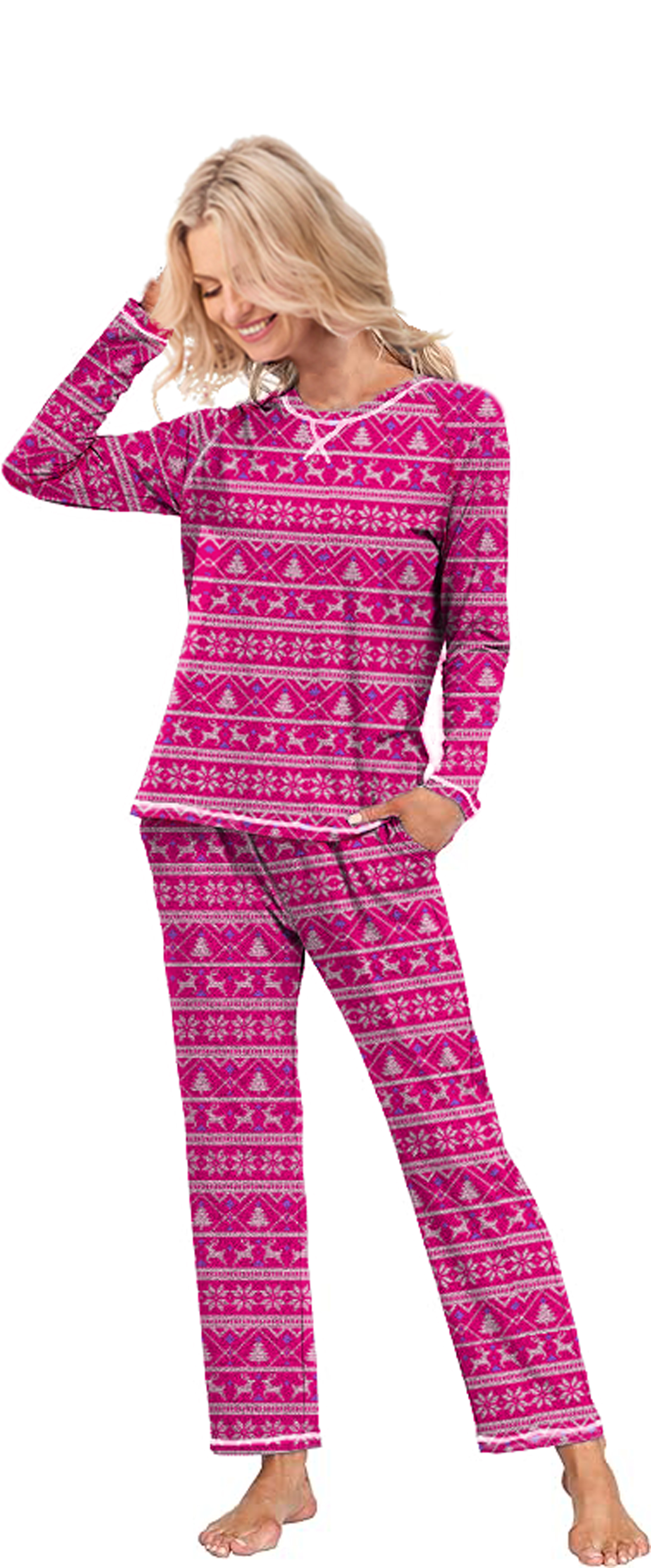 A COZY WAY TO SPEND A RELAXING DAY, IN YOUR FAVORITE PJ'S. THIS SET OFFERS A CREW NECKLINE, LONG SLEEVES, ELASTIC WAISTBANDN PANT AND 2 SIDE POCKETS IN THE PANTS WITH THIS FUN FAIR AISLE PRINT.Specifications