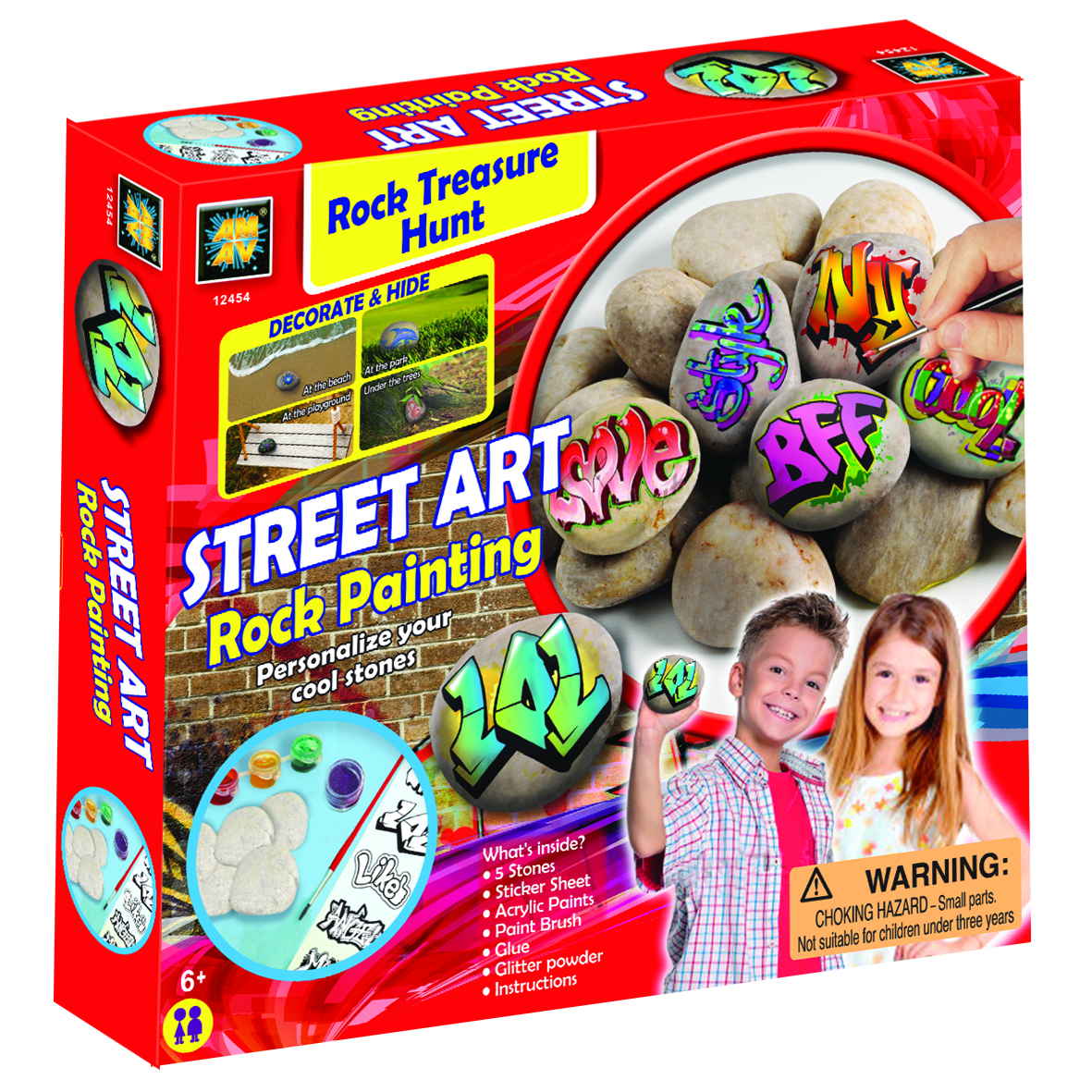 Graffiti Rock Painting - The classic craft that makes kids and adults smile and have a fun twist; It includes five rocks a brush a sheet of design transfer stickers two colors of glitter glue six non-toxic and waterproof acrylic paints glue colorful gemstones and easy-to-follow instructions; Positive Crafts: Craft and paint rocks are so much fun; SAFE SET - The Amav Rock Paint Kit is ready to paint and 100% safe to use; Screen-Free Activity: The Amav Rock Painting Kit is a fantastic opportunity to give your kids a break from screens; Whats Inside - Our Graffiti Paint Kit includes everything you need to create an amazing collection of graffiti rocks