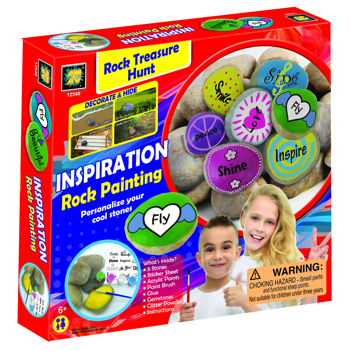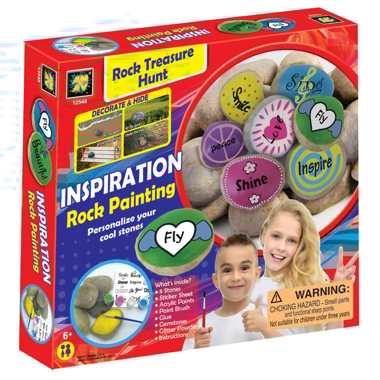 Let your creativity & imagination go loose and create your very own original rock painting on real pebbles, for others to randomly find and get inspired!be part of the International craze of hide & seek rocks and spread positivity and encouragement throughout your community! great screen-free activity to do with your kids, friends, and family.Perfect Group activity for holidays, sleepovers, and birthday parties!ready to paint & safe to usethis all-inclusive kit contains the waterproof supplies you need for your rock Paint creations! our acrylic paints are non-toxic and safe to use.Our rocks are not perfectly round, smooth, and not sharp!what's inside: our rock painting kit includes everything you'll need to create an amazing rock collection! Comes with five rocks, a paintbrush, a sheet of design transfers stickers, two colors of glitter glue, six water-resistant paint, glue, colorful gemstones, and easy to follow instructions. Recommended for kids aged 6 and up.Specifications