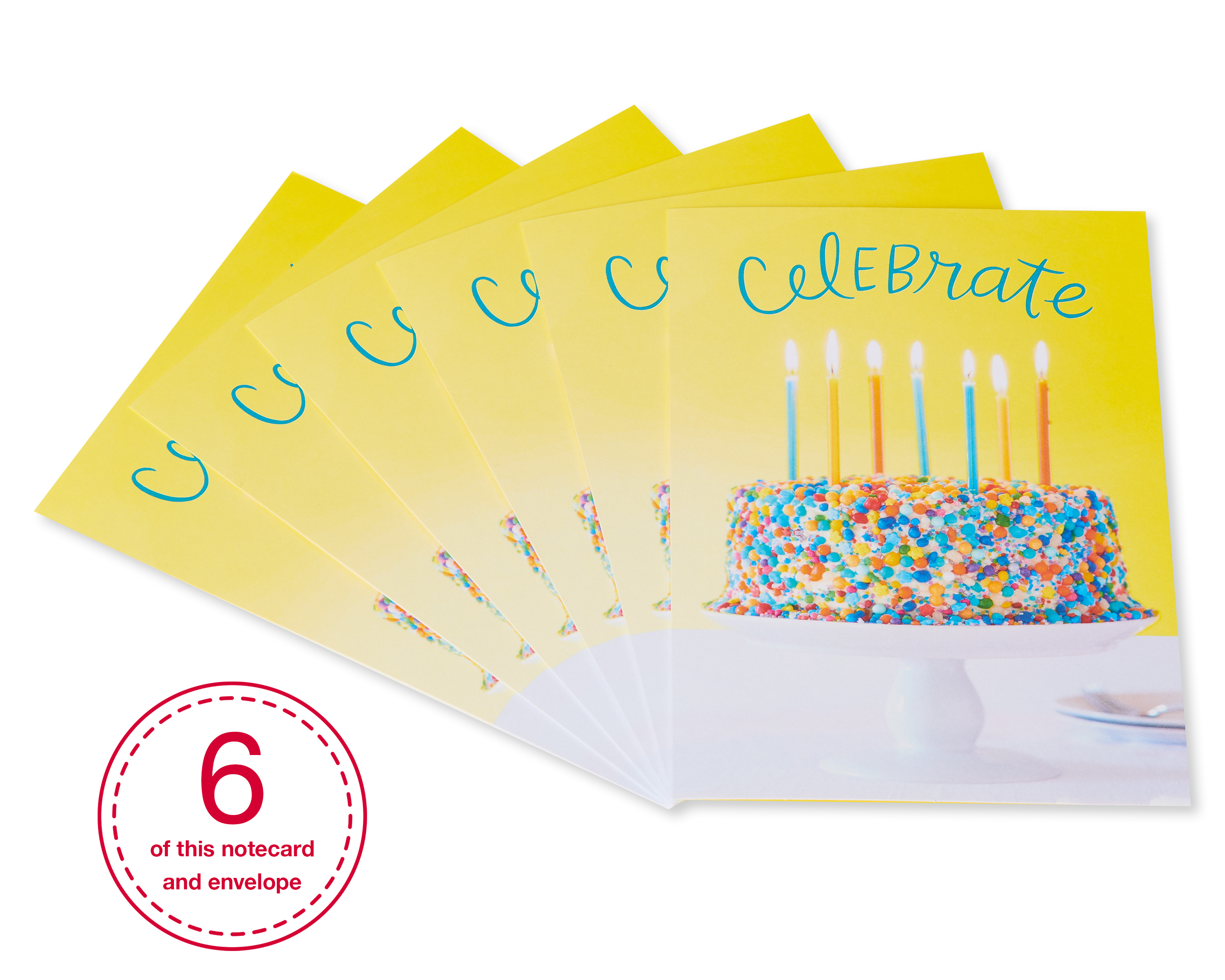 This festive card features a colorful cake with candles on a bright yellow background.; Cards measure 4.625 in. x 6.75 in. Includes 6 cards and 6 envelopes; American Greetings offers exceptional greeting cards, gift wrap and celebration products so you can connect in ways that fit your personality and authentic styleSpecifications