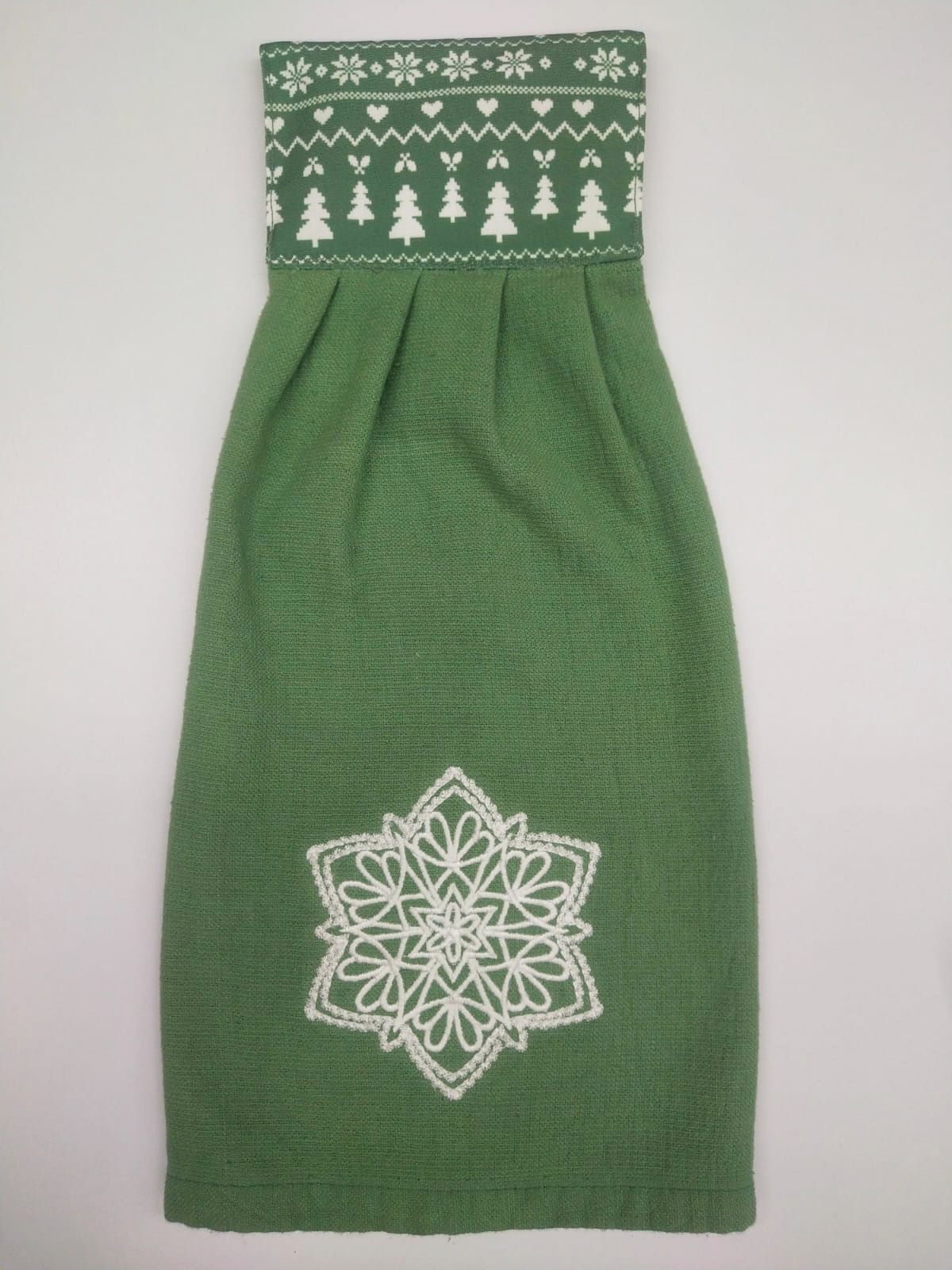 Add a festive touch to your kitchen this holiday season with our Christmas Kitchen 2025 Hang-Up Towels (2PK). Designed for both style and functionality, these decorative towels feature cheerful holiday patterns and a convenient hanging design, making them a must-have for your kitchen. Set of 2 Hang-Up Towels Includes one snowflake-themed towel in deep foliage green with an elegant lace-style print and one festive checkered towel in classic Christmas red, green, and white. Convenient Hanging Flap The 5.5 IN flat woven border with a flap allows easy hanging on oven handles, hooks, and towel bars, keeping towels in place for daily use.Specifications