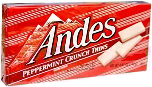 Indulge your taste buds with Andes Peppermint Crunch Thins! Each delicious and creamy, foil wrapped pieces contains crunchy bits of peppermint.Ingredients: Sugar, Palm Kernel and Palm Oil, Nonfat Milk, Milk Protein Concentrate, Lactose, Flaked Corn, Yellow Corn Flour, Colors Added (Red 40 Lake, Yellow 5 Lake, Blue 1 Lake), Peppermint Oil, Corn Starch, Soy Lecithin (An Emulsifier), Corn Syrup Solids.Specifications