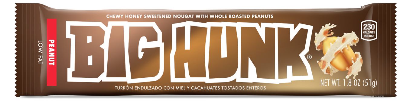 Big Hunk is an old-fashioned candy bar favorite and has been since Annabelle acquired it in 1970 from Hollywood Brands. To this day, it can still boast, True to its name, Big Hunk is made of a generous portion of chewy, honey-sweetened nougat, filled with whole roasted peanuts and in keeping with the name, each generously sized candy bar weighs in at 2 ounces and measures over 8 inches long. An added bonus to health conscious candy lovers is that Big Hunk is one of the few candy bars on the market today - considering how long Big Hunks have been available, perhaps, we should say, "are still on the market today" - with very low fat content and qualifies as a "low fat" item with just 3 grams of fat for a generous 2-ounce bar." It's Gluten Free too.Specifications