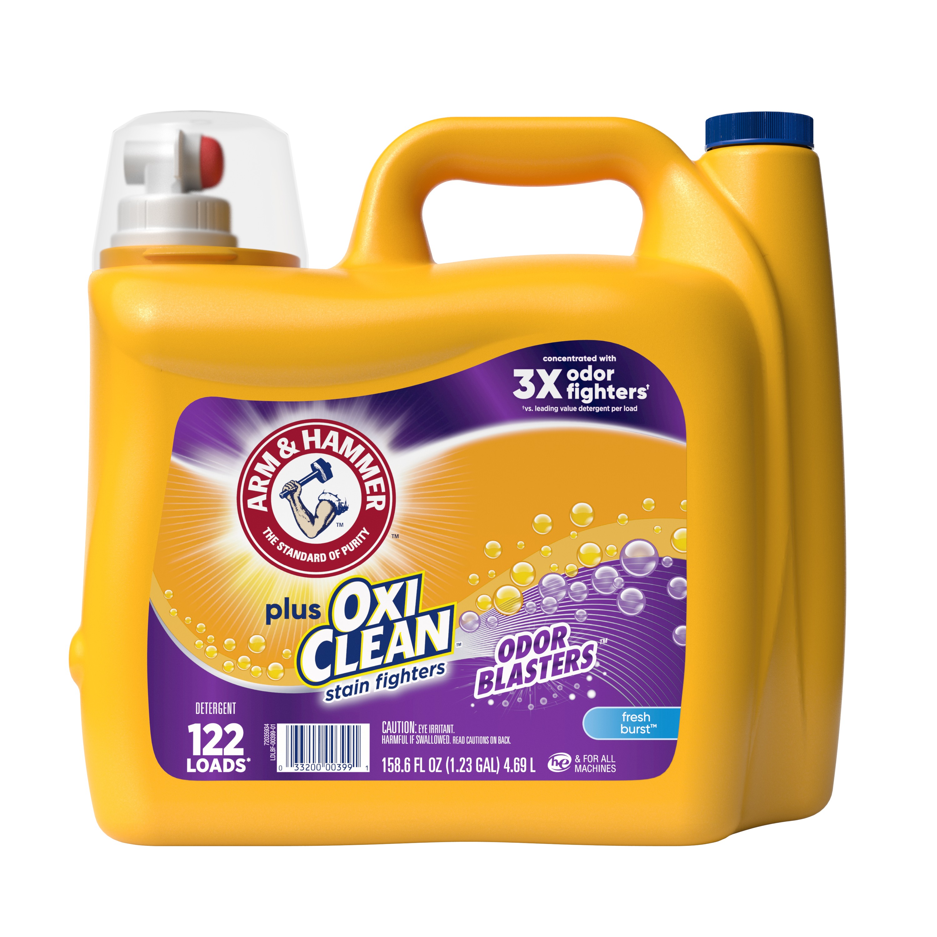 ARM & HAMMER Plus OxiClean with Odor Blasters Liquid Laundry Detergent is specially designed to eliminate tough odors. Our formula doesn't just cover up odors...it blasts them away. This concentrated laundry detergent boasts triple power: it fights tough odors, blasts away stains and boosts freshness. Concentrated with 3X powerful odor fighters in every load versus the leading value detergent, this detergent handles your toughrst loads in all wash temperatures. Safe to use in a standard or HE machine.Specifications