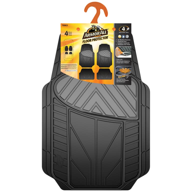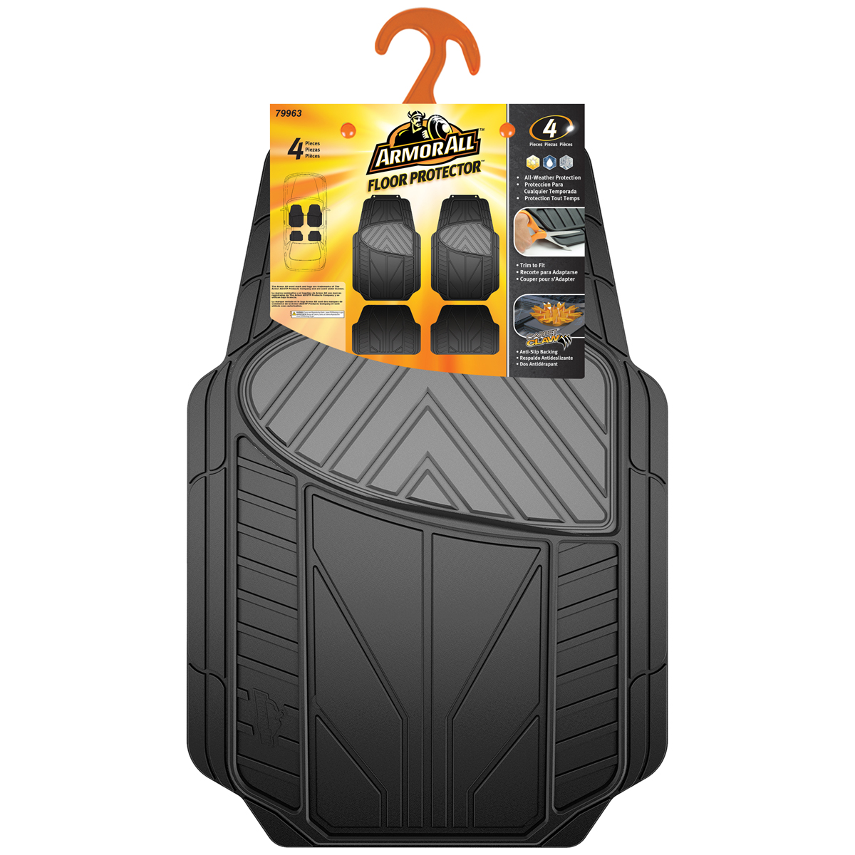 Armor All season black and grey floor mats protect your vehicles interior and add stylish design. Heavy duty rubber with deep wells protects your vehicle from rain snow and mud. Universal fit with trimmable design. Protect and enhance your vehicles interior with the brand you can trust.Specifications