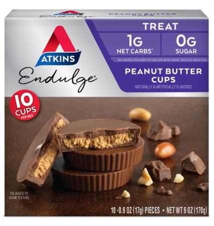 Tastes just like what you’re thinking of, with not one bit of remorse. Creamy milk chocolate flavored cups filled with peanut butter. Atkins peanut butter cups have 1g net carbs and 0g of sugar making them the perfect guilt free treat.1g Protein0g Sugar2g Fiber80 CaloriesSpecifications