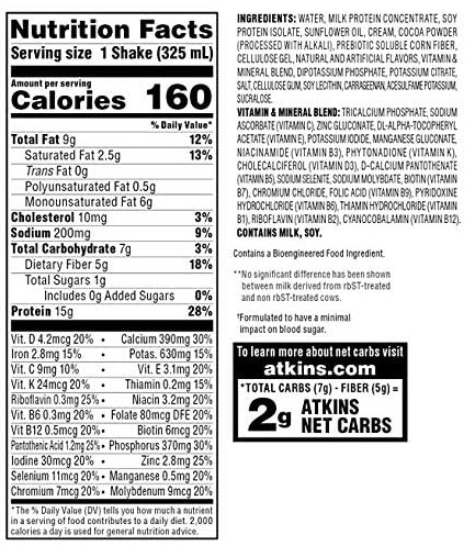 Atkins delicious, creamy, milk chocolate flavored shakes are sure to satisfy your hunger. These shakes are packed with protein, a good source of fiber, and have 1g of sugar to keep you going throughout your busy day. That's why it's the drink of chocolate-loving champions.Specifications