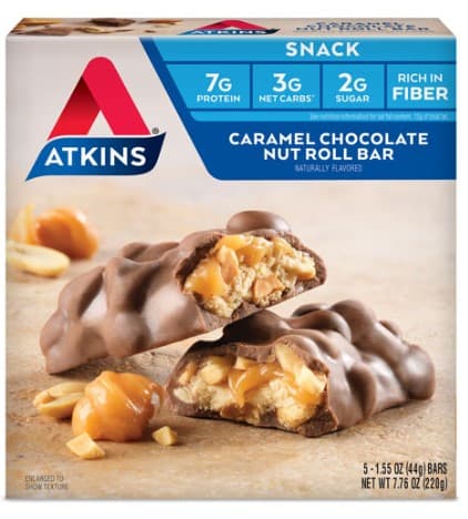2 grams of sugar and 3 grams of net carbs per serving; 7 grams of protein per bar and 7 grams of fiber; A decadent peanut-nougat center covered with a thick layer of caramel all dipped in a rich chocolaty coating; Keto friendly! When used with Atkins ketogenic programs; Perfect for a low-carb lifestyle