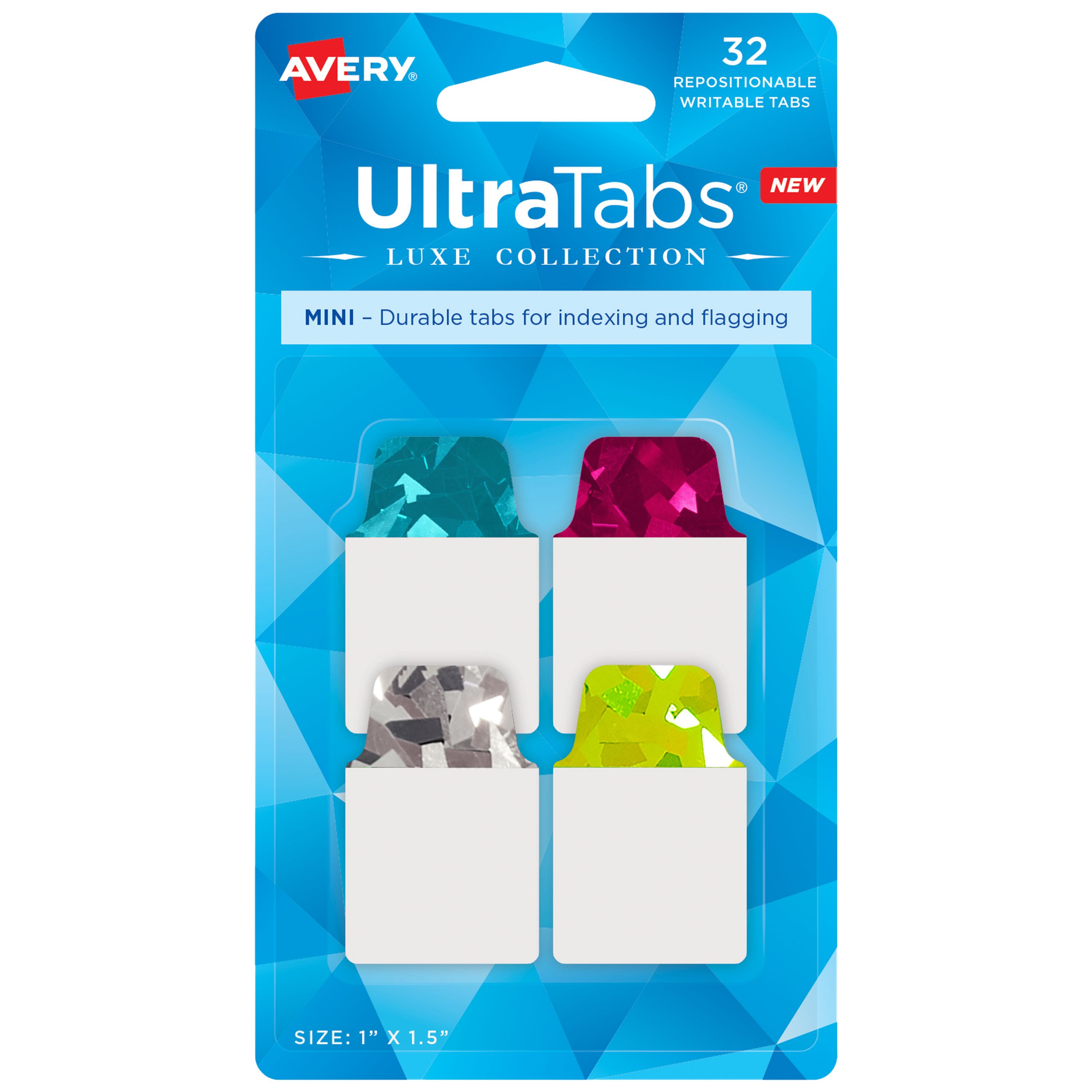 Bold yet sophisticated, the Avery Ultra Tabs Luxe Collection provides an upscale touch to any project. Upgrade your planners and journals to another level with these holographic iridescent designs available in turquoise, magenta, yellow and silver jewel tones. The reflective material shines in sparkling angles that create a prismatic effect that will add a remarkable glow to your supplies.Each mini tab is composed of a durable 3/4" x " tab and a 1" x 1" adhesive and transparent tab body. Both sides of the tab display the unique prismatic design for the highest visibility. The tab itself is compatible with most permanent markers including Avery Marks-A-Lot markers. The clear tab body is also handwrite-compatible with permanent markers as well as most pencils, pens and highlighters.The clear body of the tab features a smudge-resistant surface for writing. Drying time varies depending on the ink used. A repositionable adhesive is used on the other side of the tab body that securely keeps the tab attached once applied while still allowing for quick removal to avoid residue and damage.Specifications