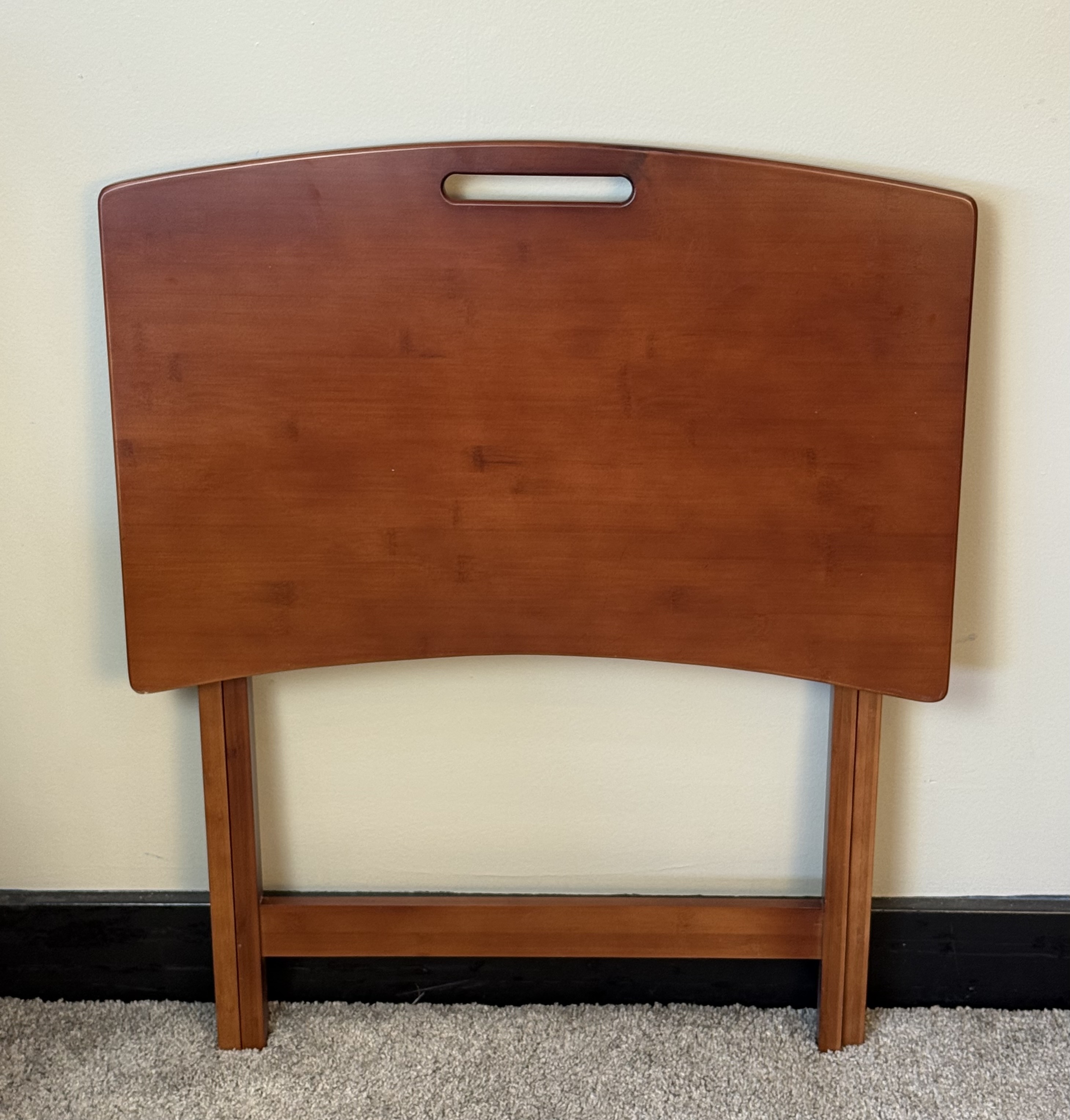 Solid Bamboo Folding Personal Work/Leisure Table; Folds Flat for Storage; Curved Ergonomic Shape and Height for Convenitent and Strong work Surface; Mahogany Finish on Solid Bamboo Frame; Size 26"H x 27"W x 16"DSpecifications