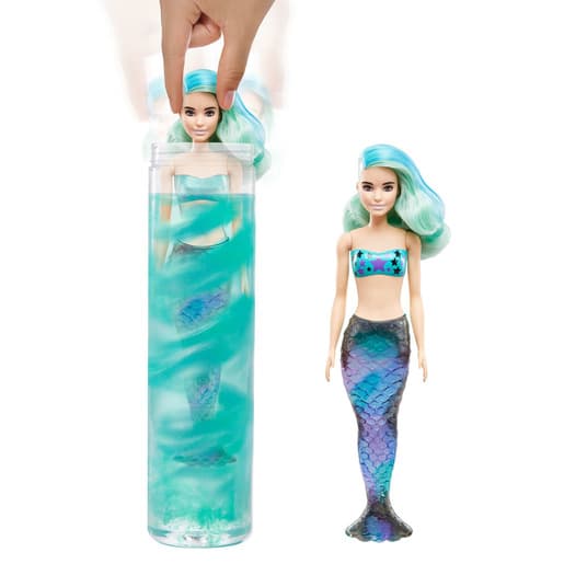 (we cannot guarantee speciific styles) A gorgeous mermaid doll is guaranteed, but each doll's look remains a mystery until revealed. Each doll has a different combination of eye color, hair color, skin tone and decorated bodice, but the surprises continueopen the bags to discover a mermaid fin, a necklace, a brush and a small sponge. Each series has a unique theme -- these Color Reveal Barbie dolls celebrate mermaids, with colorful long hair and gorgeous mermaid tails. Use the tube to store the accessories and other favorite Barbie pieces.Specifications