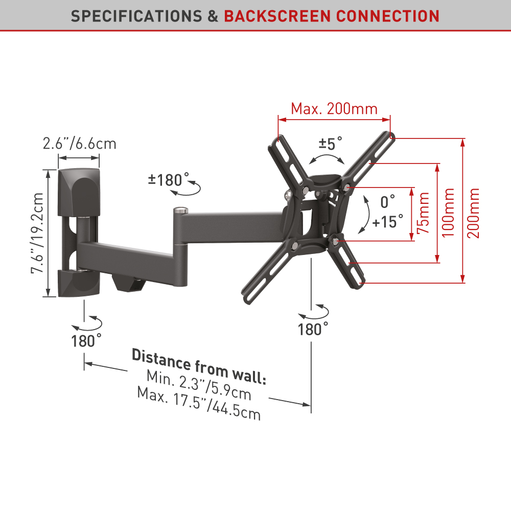The Barkan full motion, four-movement TV mount with rotate, fold, swivel and tilt options fits flat / curved screens sizes 13 - 43 inches and weight up to 55 lbs. The minimum distance between the mount and the wall is 2.3 inches and the maximum distance is 17.5 inches. It fits TVs with VESA standard (bracket mounting holes patterns) 75x75, 100x100, 200x100, 200x200 mm and non VESA up to 200x200 mm. In order to offer a better point of view, the mount has three pivots: near the wall 180 degrees, foldable 360 degrees, swivel near the screen connection plate 180 degrees and also tool free tilt from 0 till 15 degrees. The mount comes with a lifetime warranty.Specifications