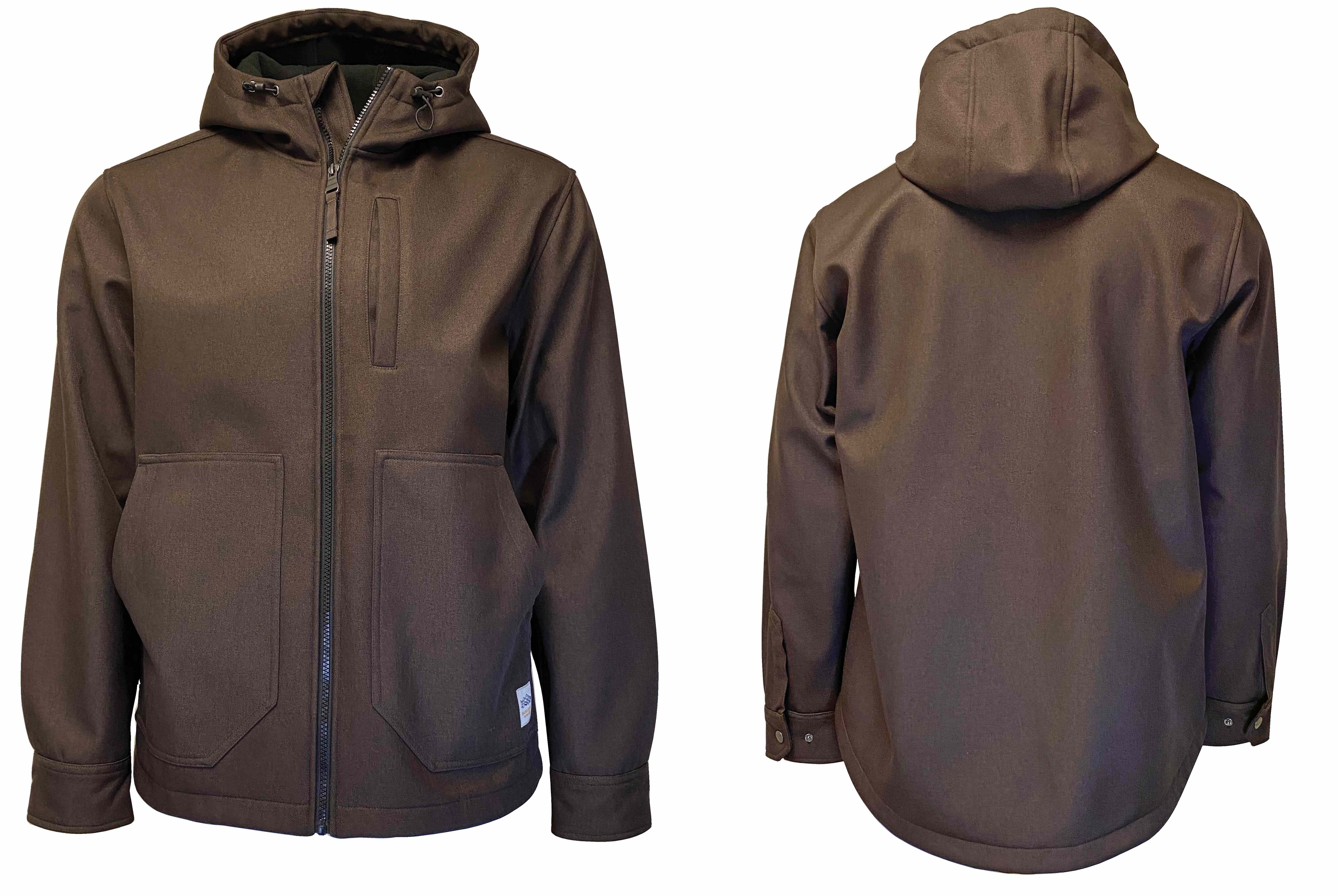 BONDED TO WINTER FLEECE; BUNGEE TOGGLE TO ADJUST HOOD FIT; FULL ZIP; HOODED; TWILL SOFTSHELL FABRICATION
