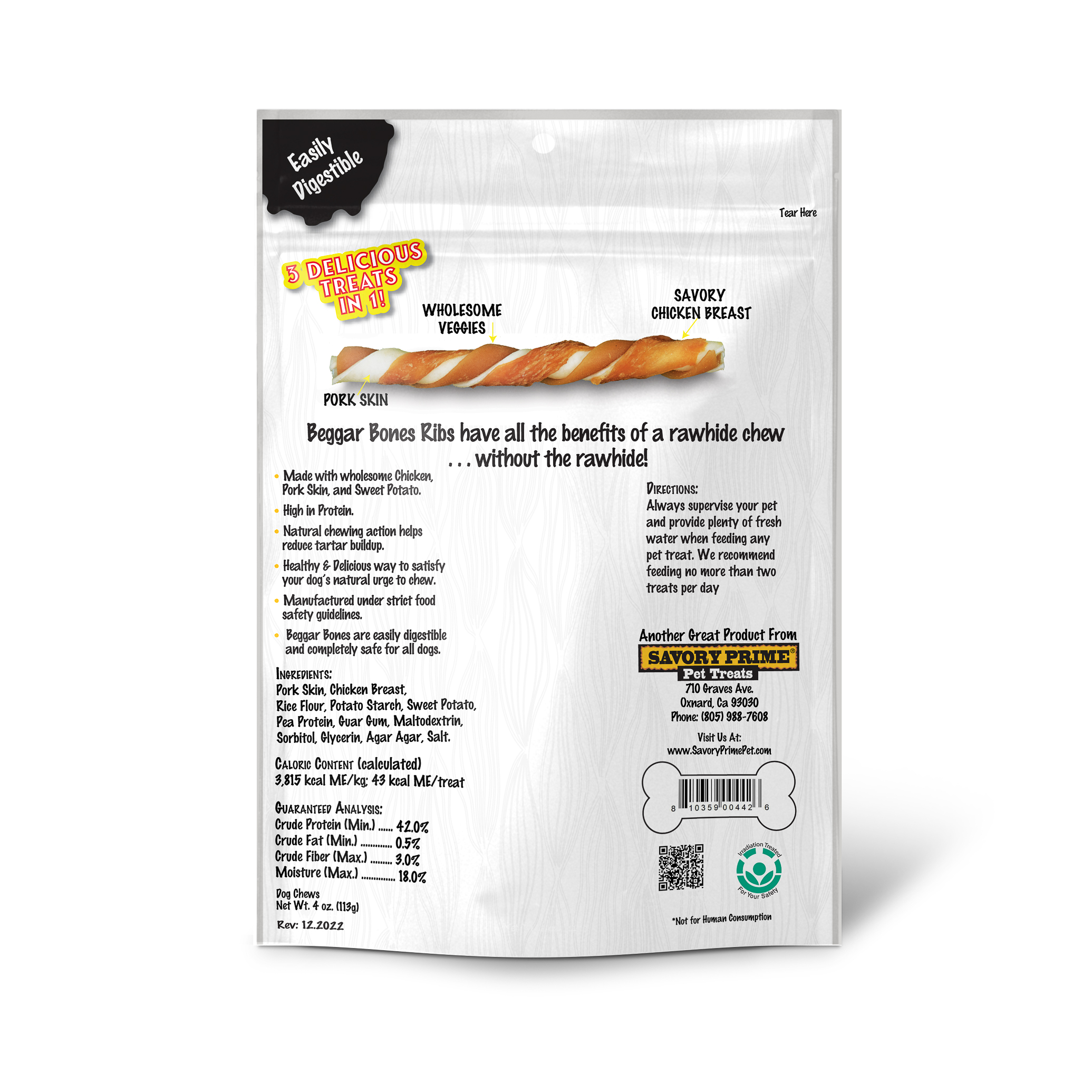 Beggar Bones Twists have all the benefits of a rawhide chew - without the rawhide! Made with wholesome pork skin, chicken breast, and sweet potato, these three flavor twists have a delicious flavor and fun shape dogs love. The natural chewing action helps reduce tartar buildup making Beggar Bones a healthy and delicious way to satisfy your dog's natural urge to chew. Manufactured under strict food safety guidelines, Beggar Bones are easily digestible and completely safe for all dogs.Specifications