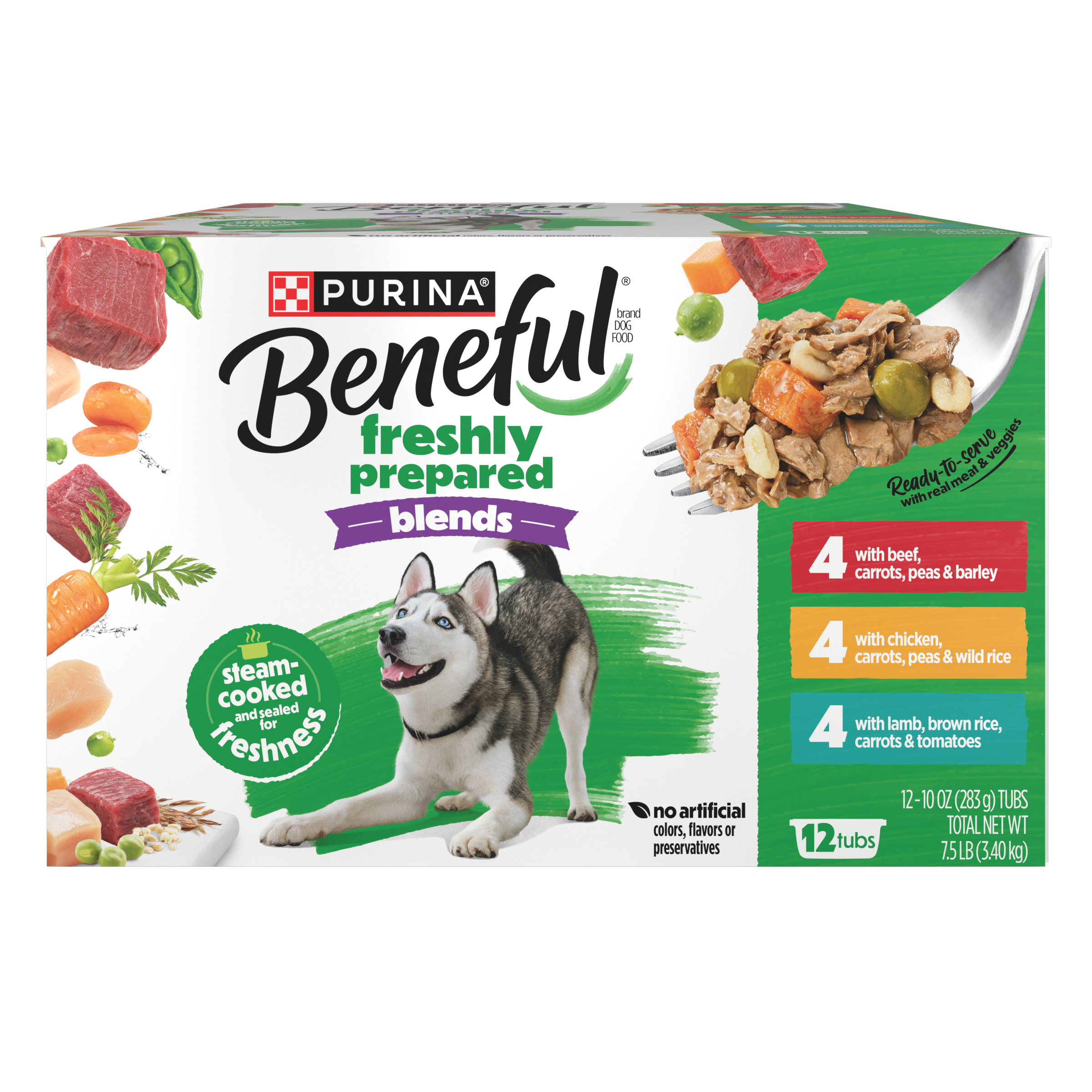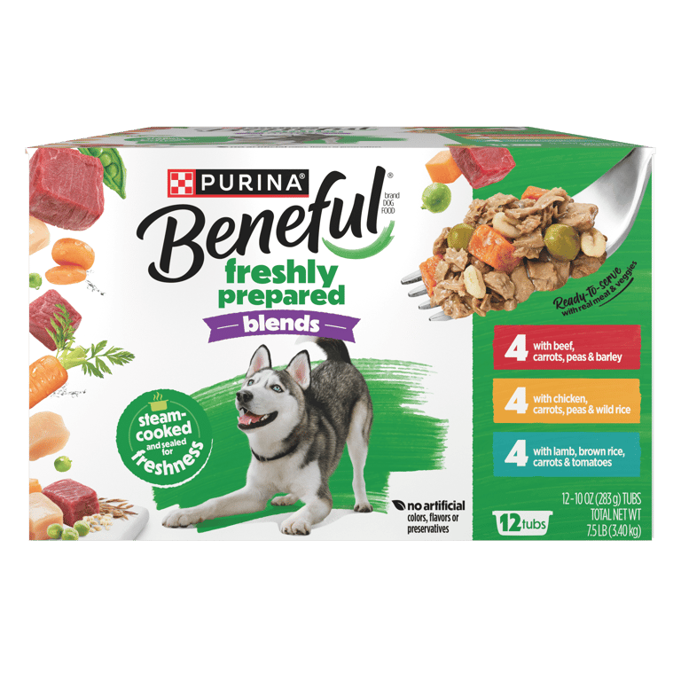 12-count Beneful Chopped Blends dog food variety pack is made with real chicken, beef or lamb and inclusions of real vegetables and grains you can see; High protein dog food helps support strong muscles and contains no artificial colors, flavors or preservatives