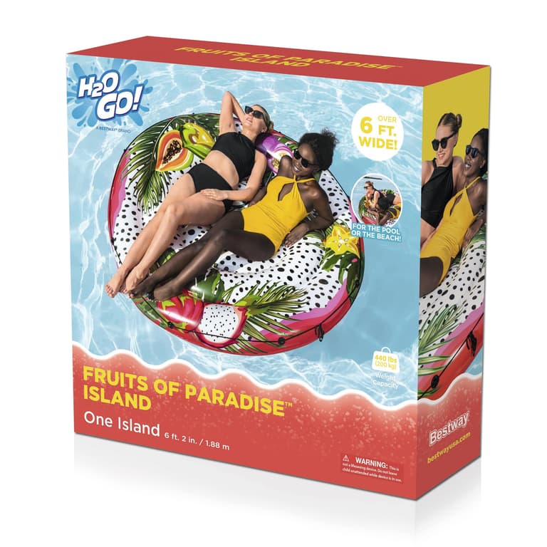 Take in the relaxing rays and vacay the island way with the H2OGO! Fruits of Paradise Island. This extra-large, 2-person inflatable island features colorful, eye-catching tropical graphics to help whisk you away to far away lands of relaxation. The included all-around grab rope with built-in grommets makes it easy to get onboard or carry the float around. Deflation is fast, simple and allows for convenient storage so you can use it season after season. Take it to the pool, beach, lake and beyond! With the Fruits of Paradise Island, you'll be floating your cares away and soaking in the blissful pool time in no time!Specifications