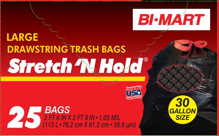 BI-MART DRAW-STRING STRETCH 'N HOLD DRAWSTRING TRASH BAGS 25 COUNT 30 GALLON SIZE