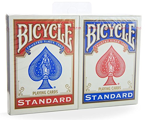 Two decks of Bicycle RiderBack Playing Cards red and blue. Each Bicycle Deck is a Standard Deck of Playing Cards consisting of 52 traditional suited playing cards two jokers and two additional ad card